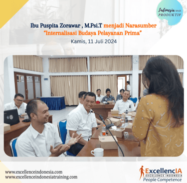 Anda tertarik untuk mengambil langkah pertama dalam perjalanan menuju pelayanan prima yang unggul? Untuk berKOLABORASI dalam menciptakan pengalaman pelanggan yang tak terlupakan. Raih kesempatan sekarang juga! Belajar dengan para ahli/pakar/trainer pada pelayanan prima merupakan langkah yang dapat mendukung meningkatkan pelayanan Anda kepada pelanggan. Salah satu Trainer dan Pakar yang dapat berkolaborasi dengan langkah baru yang Anda ambil ialah Ibu Puspita Zorawar, MPsi.T. beliau sebagai seorang pakar di bidang pelayanan prima.
